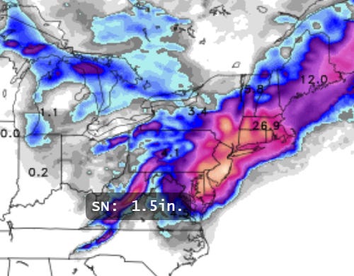 We might get an inch, it'll look pretty if you're up between 1-7 AM Monday morning, but once again, we missed the big one by 100 miles.