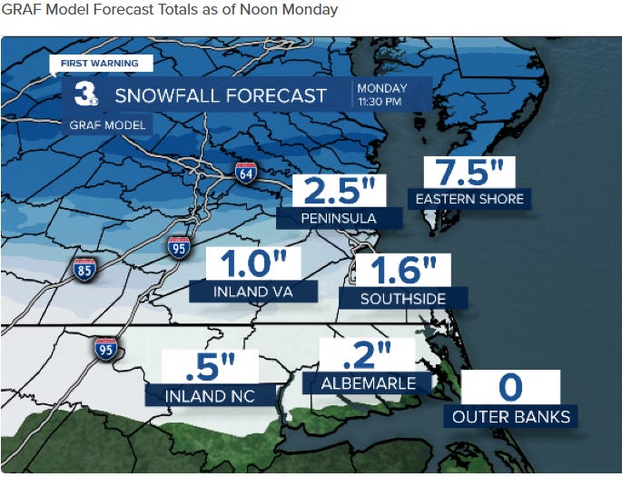 Chance of school getting cancelled Monday: 70%. I think the Winter Weather Advisory and chance of a little snow sticking will sway the schools to close, being VB and all.